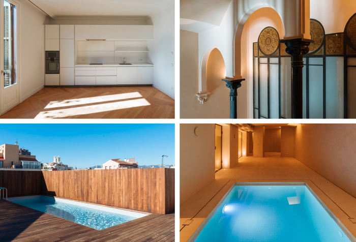Girona 2 es uno de los pocos edificios de viviendas privadas del Eixample con dos piscinas; una en el terrado (8 x 3mts) y otra en el sótano (4 x 2,5mts). Pensada para disfrutar del clima de Barcelona, la azotea también cuenta con un solárium y una zona ajardinada. El espacio sótano prioriza el relax, y cuenta con una zona fitness y una bodega (con un espacio reservado para cada una de las viviendas).