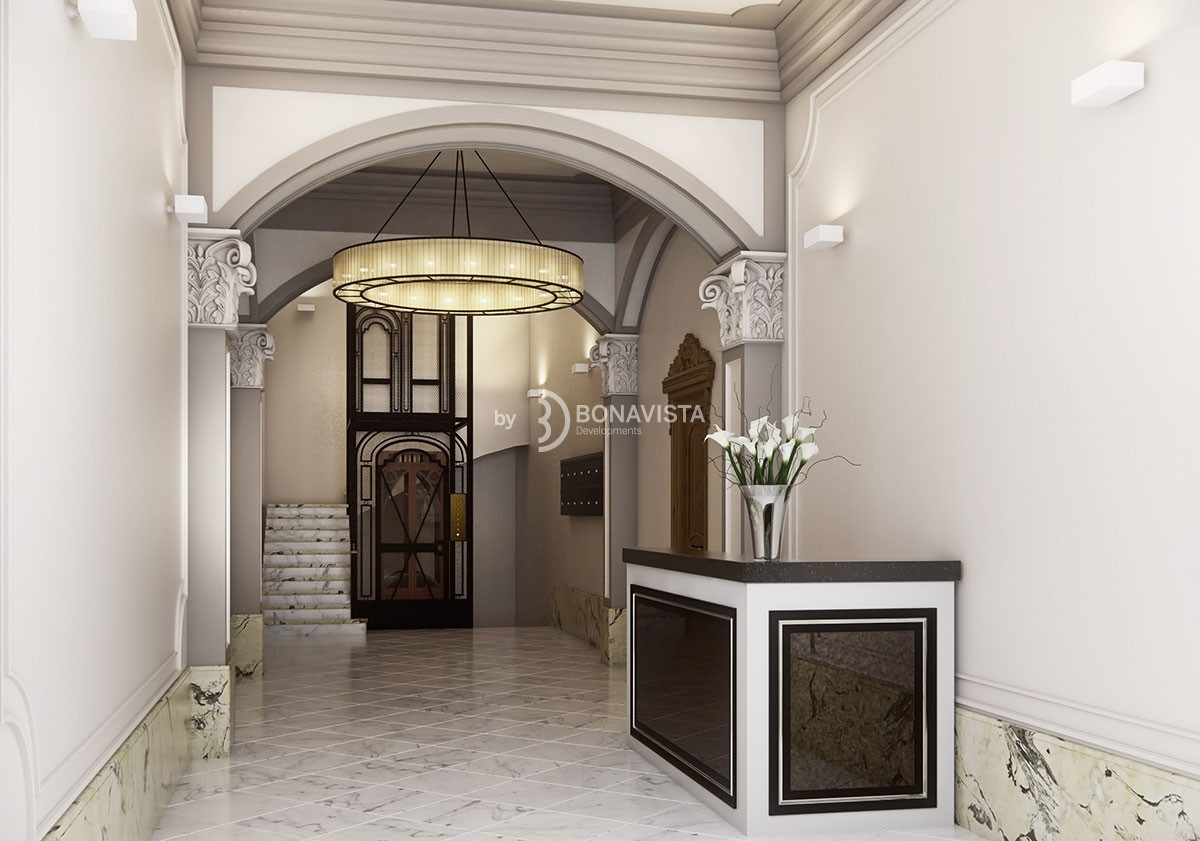 Hierro forjado, madera decapada, mármoles pulidos y elementos de latón restaurados dieron carácter a un acogedor vestíbulo.