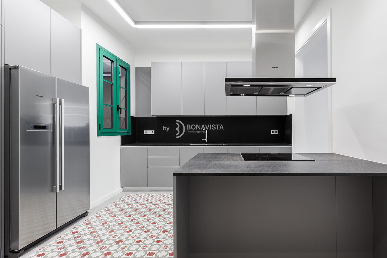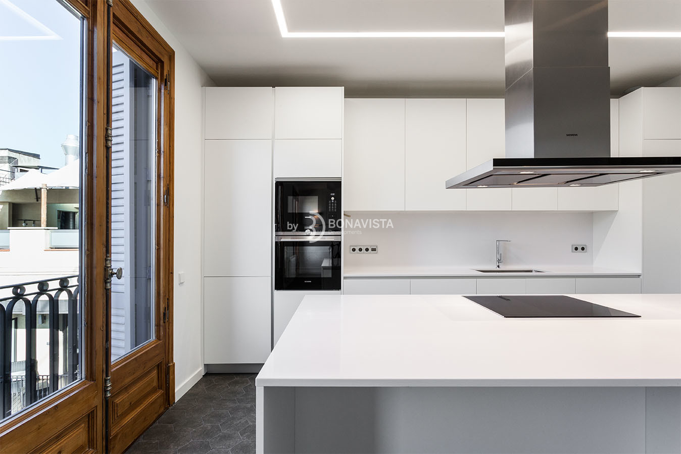 Parquet en diagonal en el salón, una mosaico de línea Gaudí en el comedor, armarios blancos en los dormitorios, cada detalle refleja una sutil síntesis de elementos esenciales.
