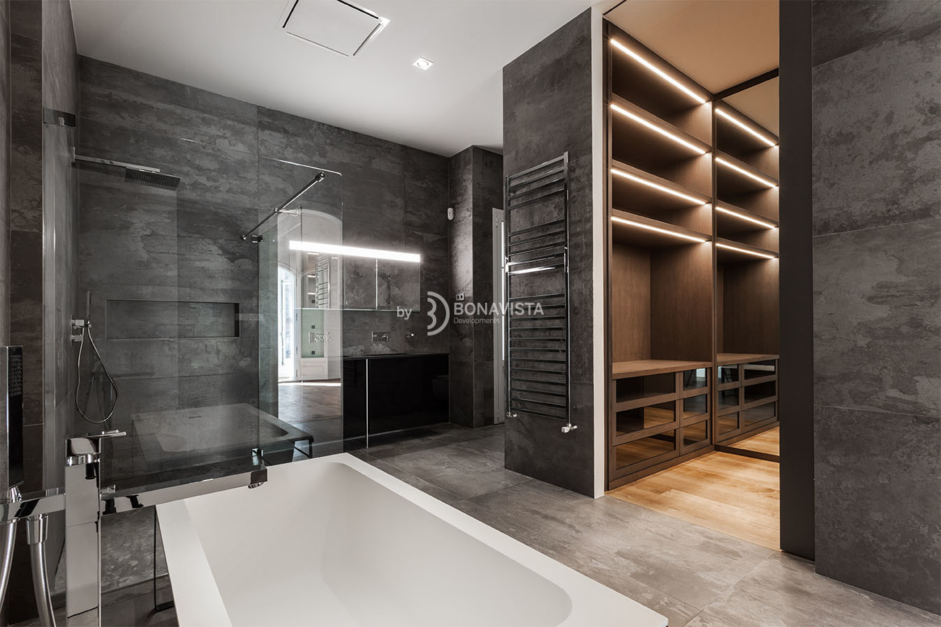 Parquet de roble natural, baldosas de diseño propio, tiradores de ébano y acero, armarios lacados del mismo color que la pared, cada detalle aporta al espacio interior un elegante aire urbano.