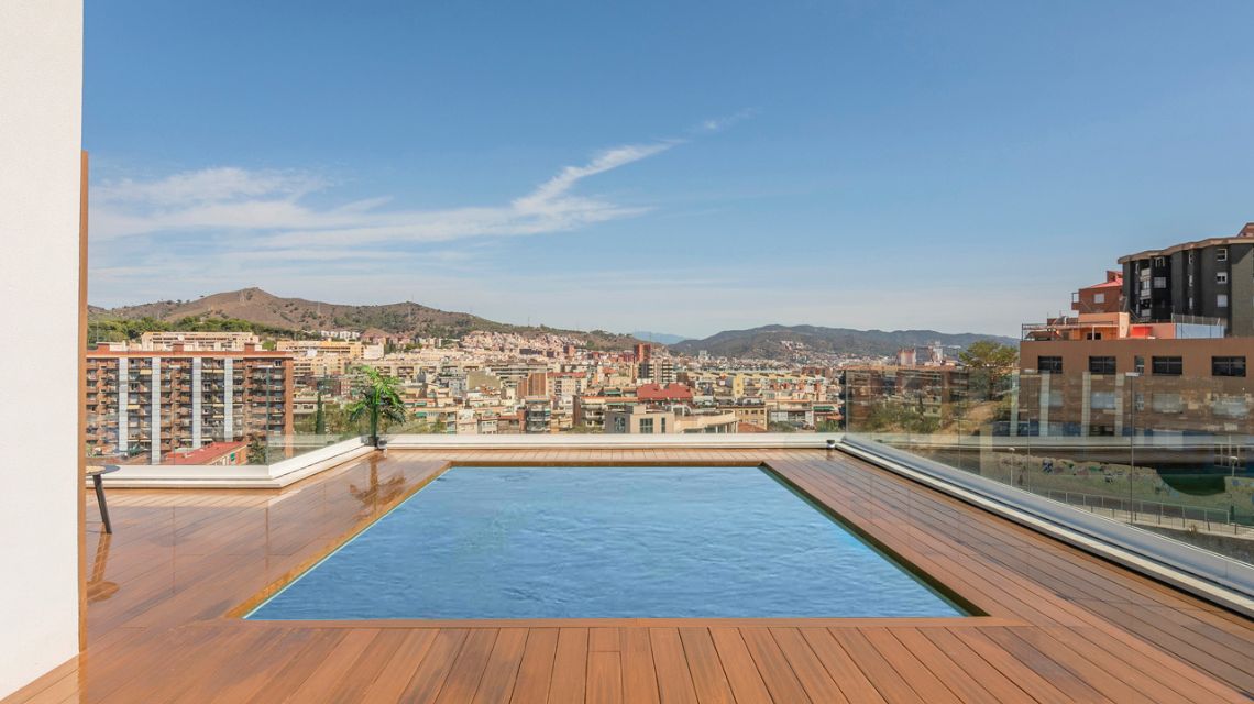 La piscina con solarium en la zona común de la cubierta es sencillamente espectacular, y sus vistas al Tibidado de Barcelona y el barrio de Horta la hacen única en la zona.
