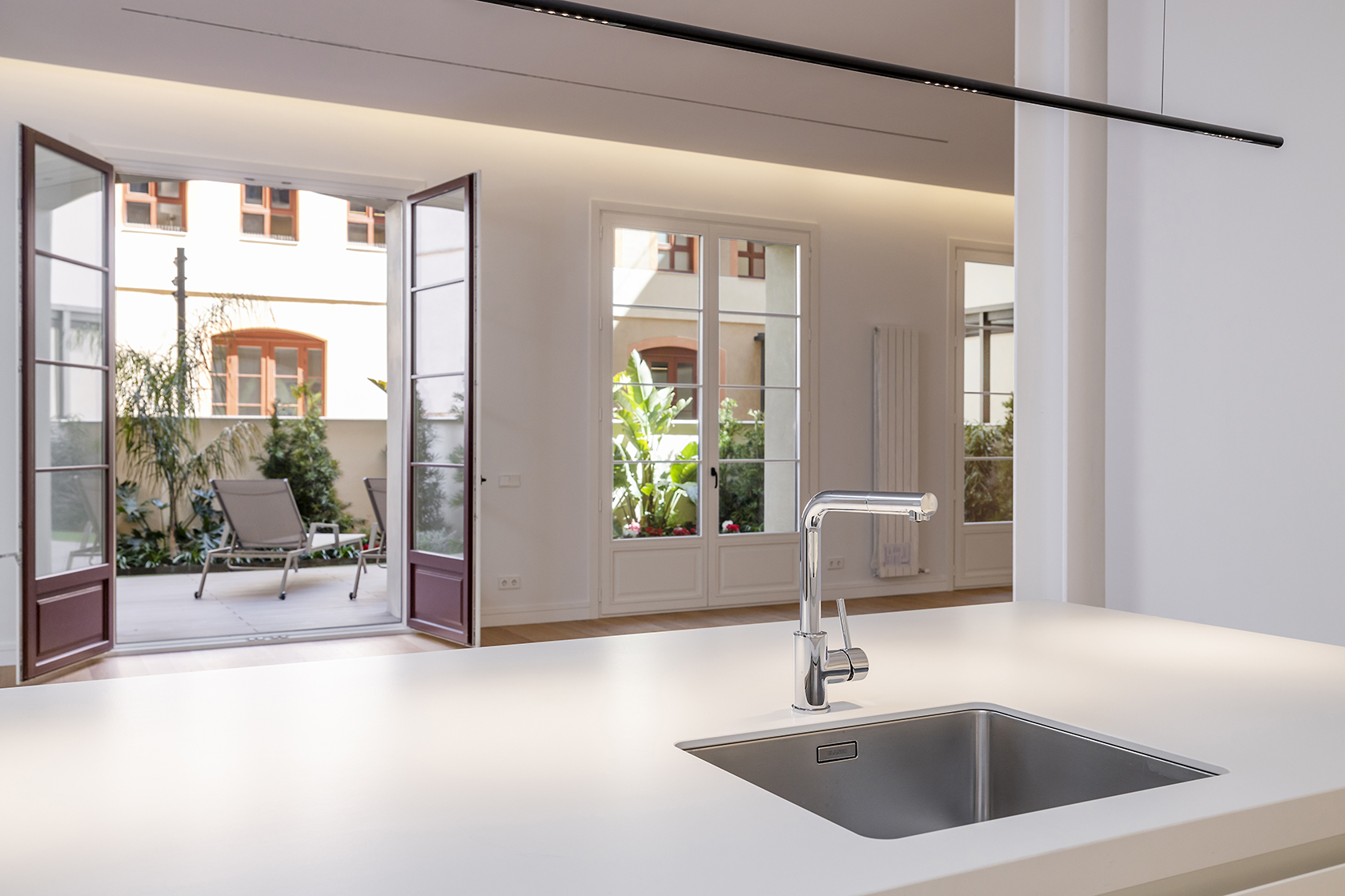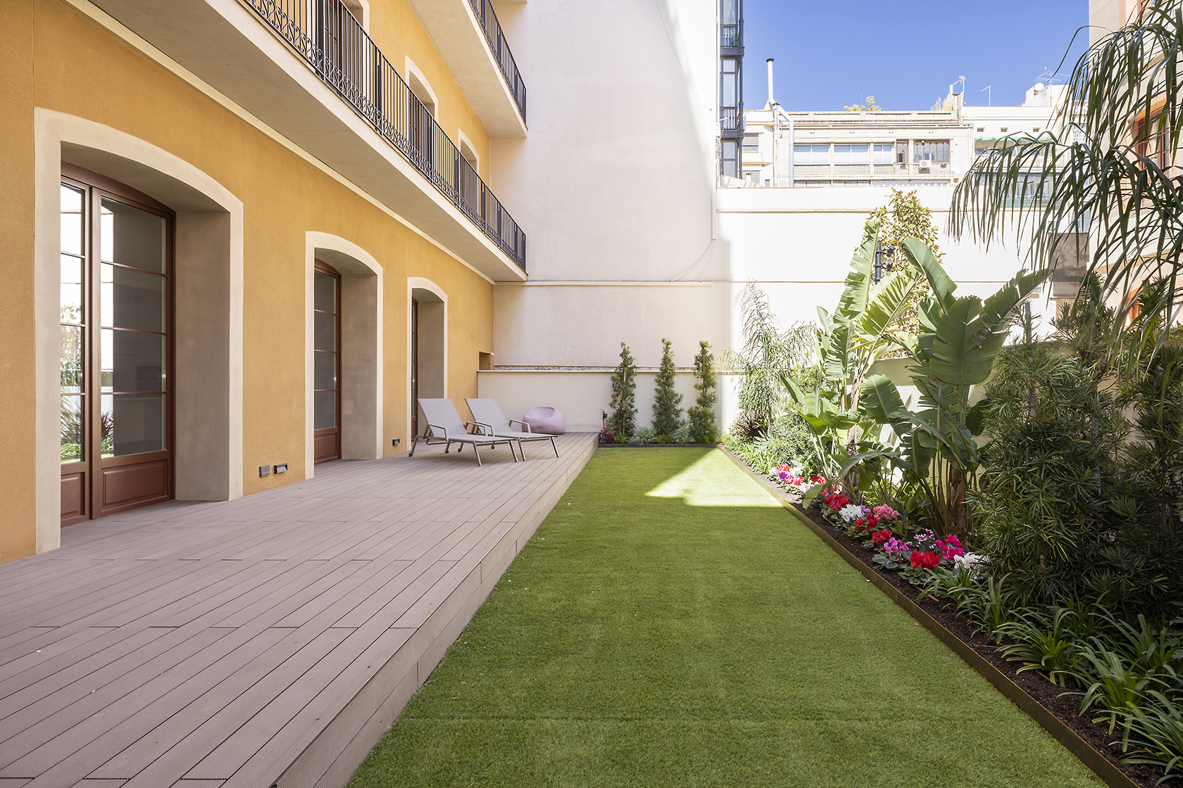 Los altos techos del dúplex (3.3 m) están sostenidos por columnas de hierro forjado para maximizar el espacio. En el exterior, el jardín y las terrazas pueden convertirse en un oasis de paz familiar dentro de la ciudad o en un espectacular espacio de ocio.