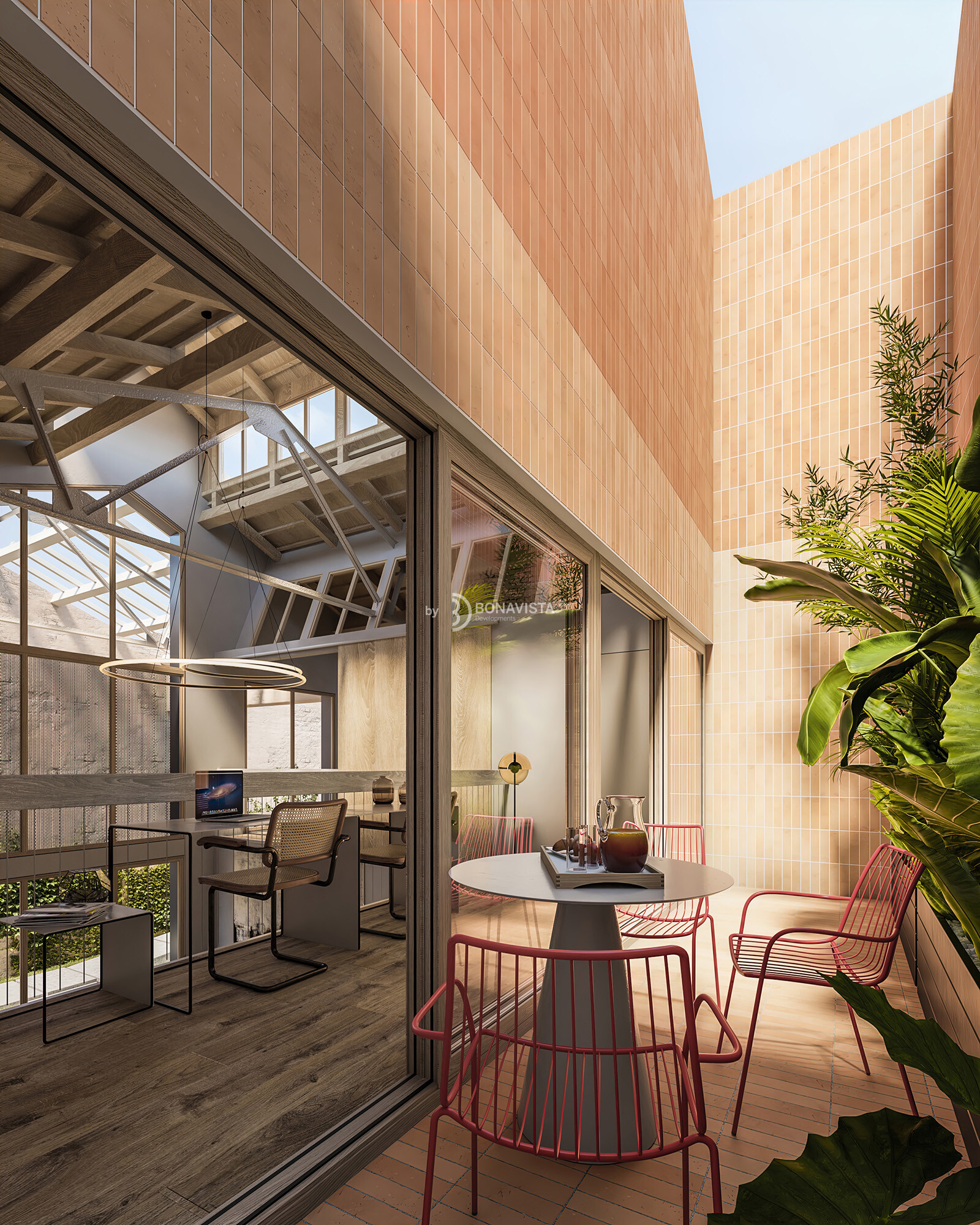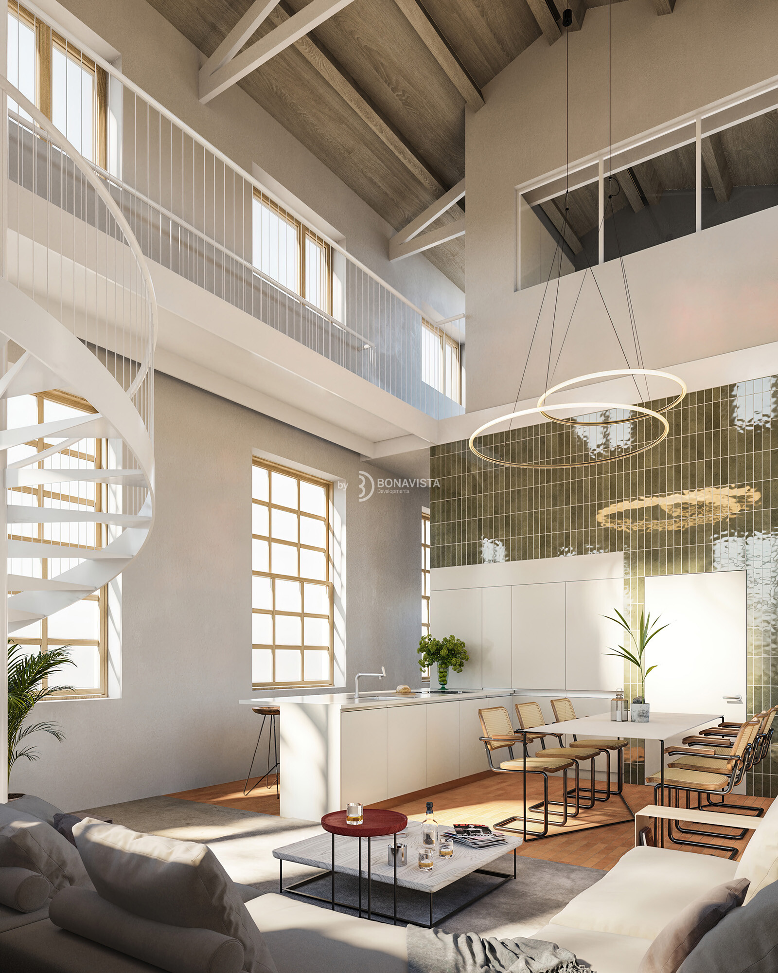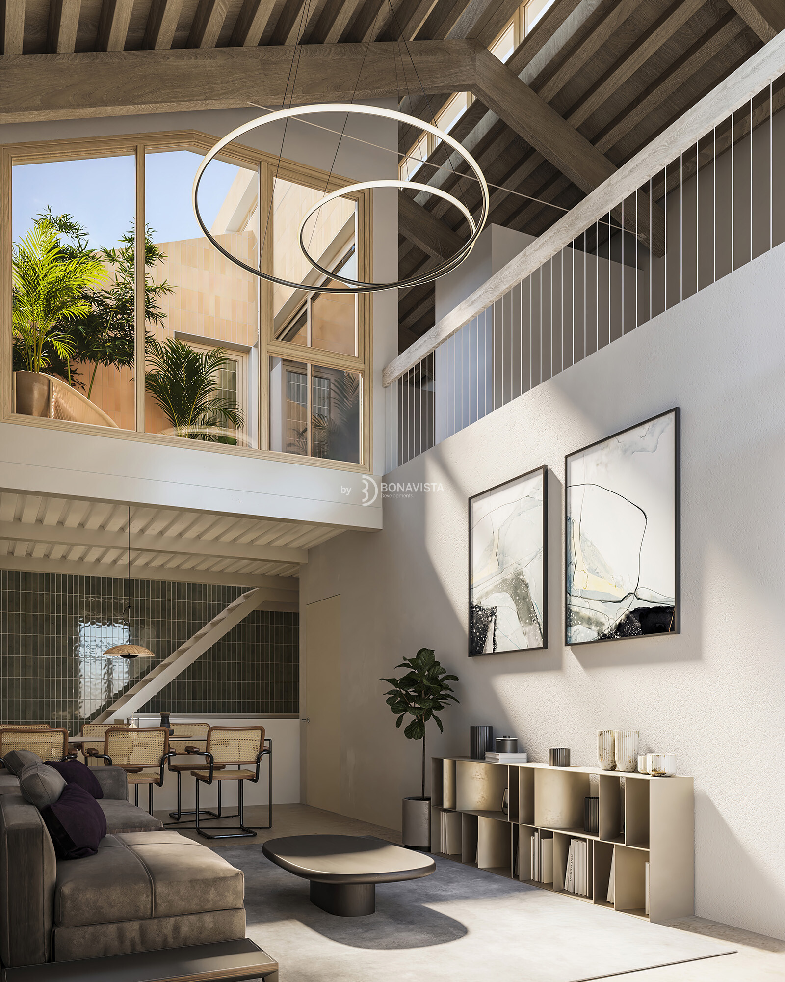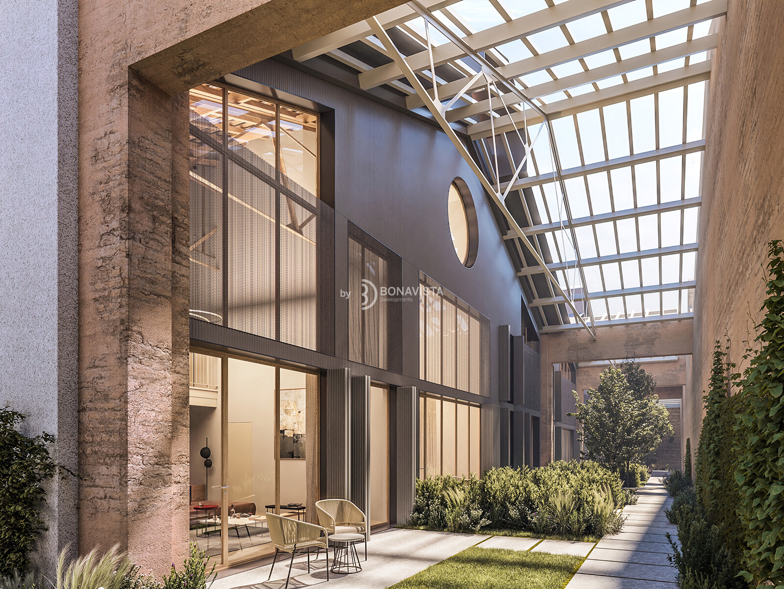 Los 4 lofts de la Nave C se ubican al lado de la icónica chimenea de Can Ricart. Magníficos volúmenes, terrazas interiores, jardines exteriores privados, lucernarios en viviendas con doble altura y un altillo abierto, ideal como zona de estudio o de trabajo.