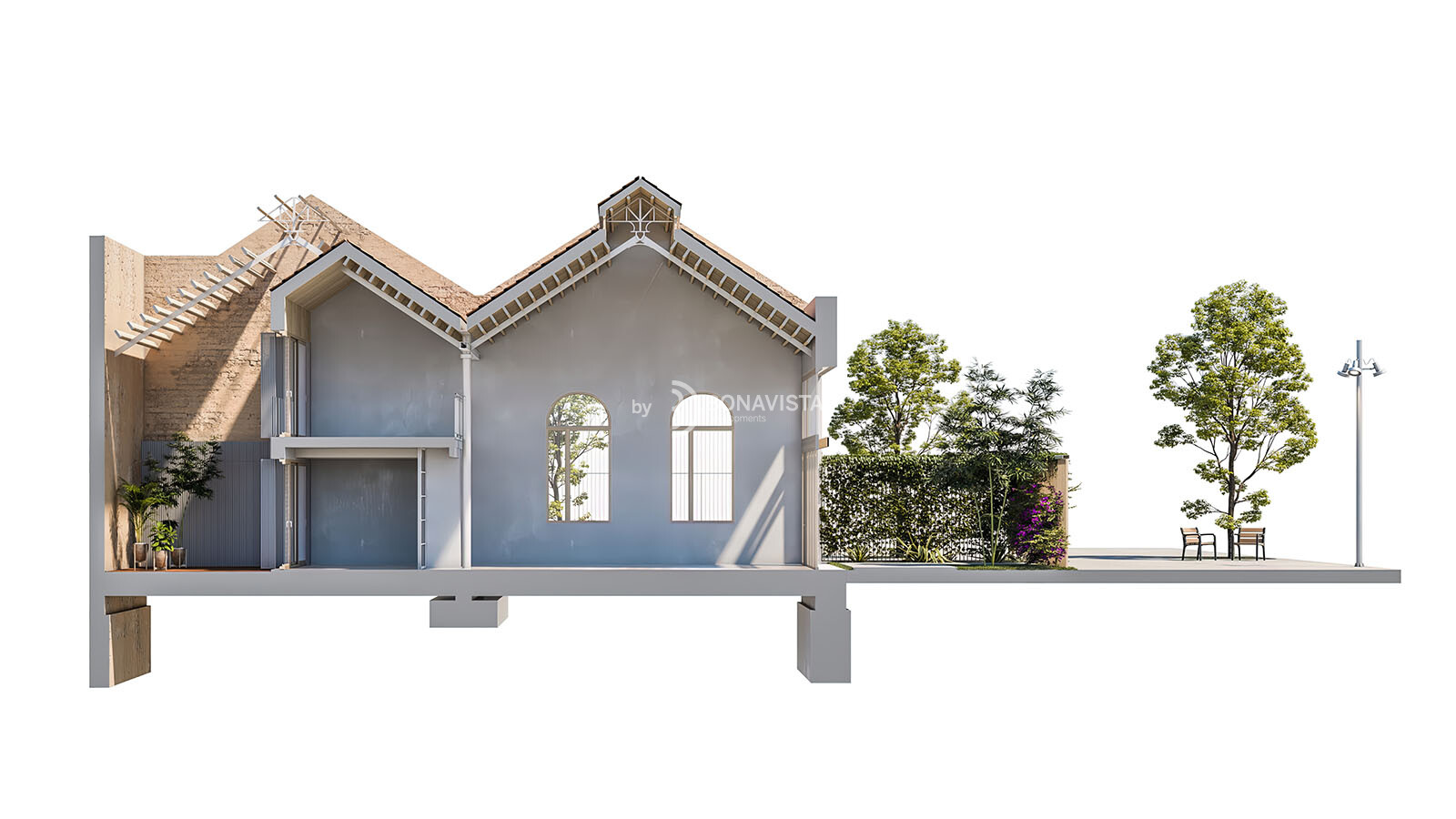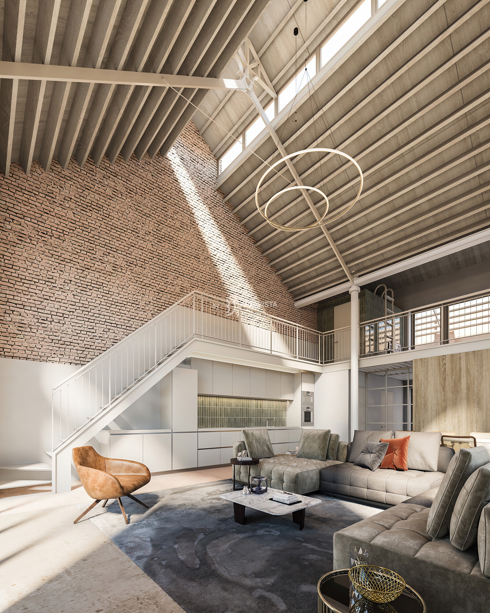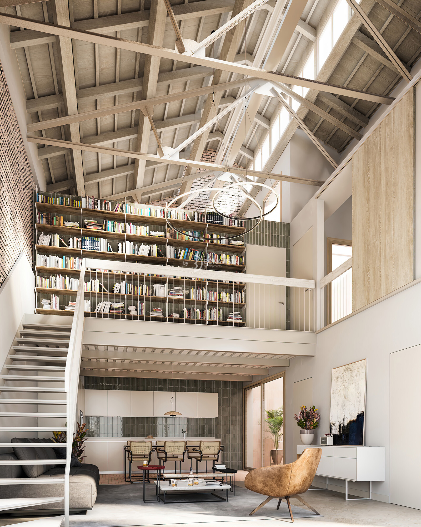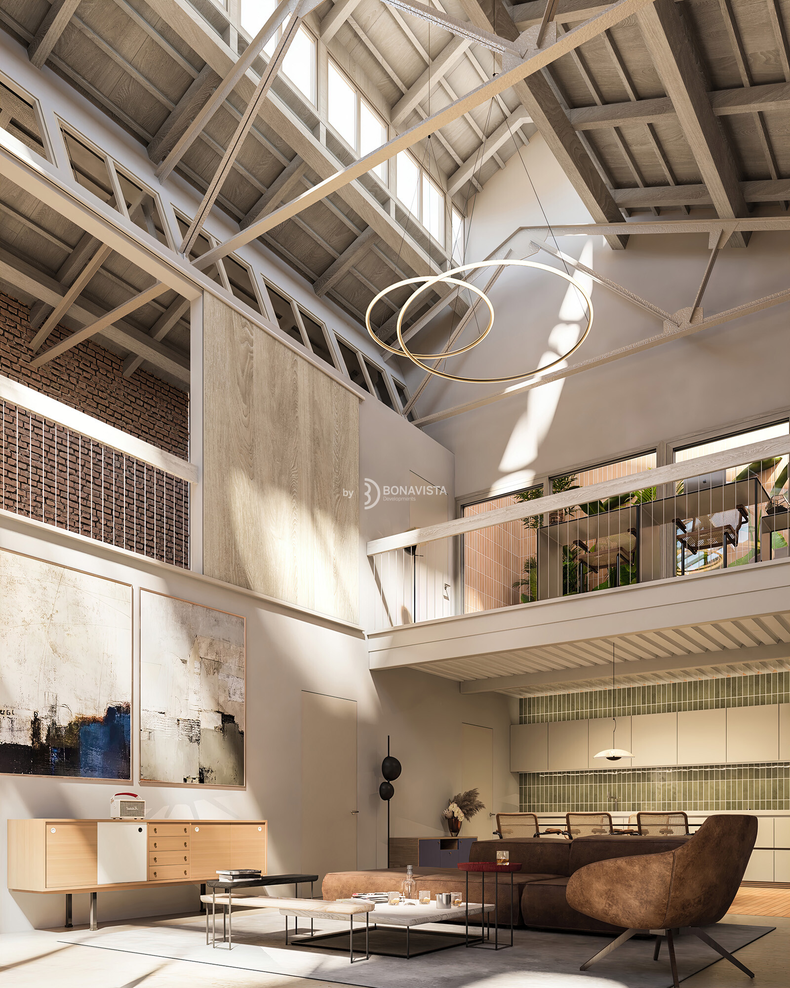 Los 4 lofts de la Nave C se ubican al lado de la icónica chimenea de Can Ricart. Magníficos volúmenes, terrazas interiores, jardines exteriores privados, lucernarios en viviendas con doble altura y un altillo abierto, ideal como zona de estudio o de trabajo.