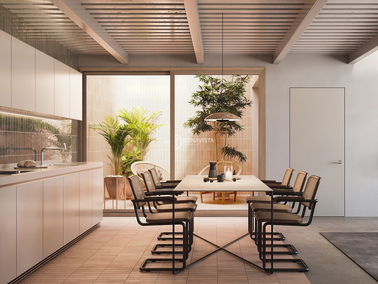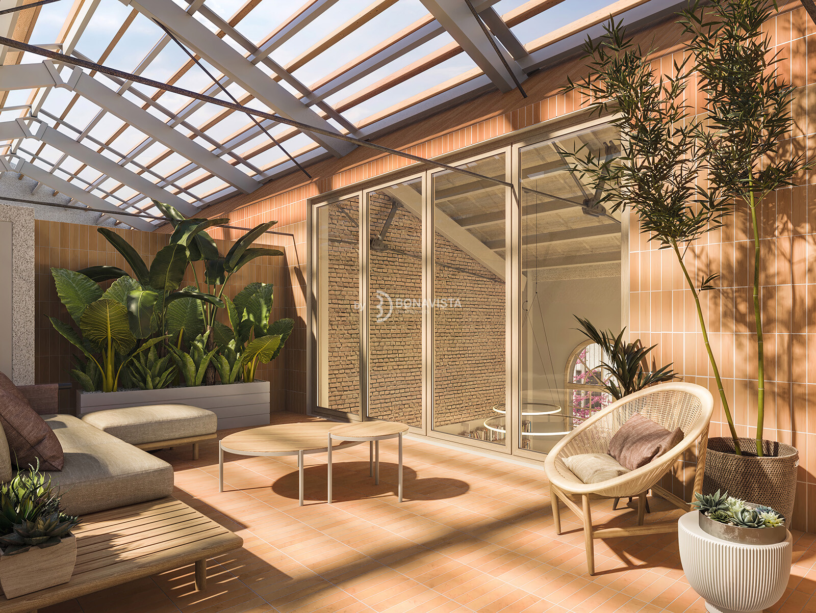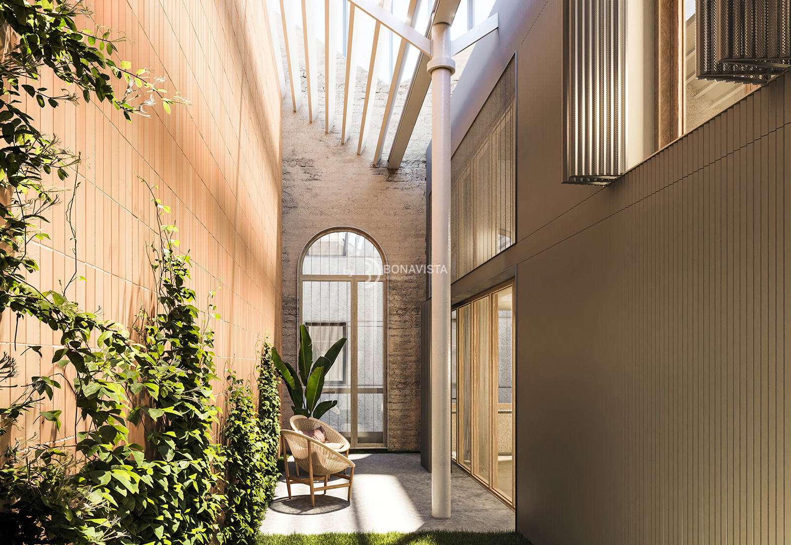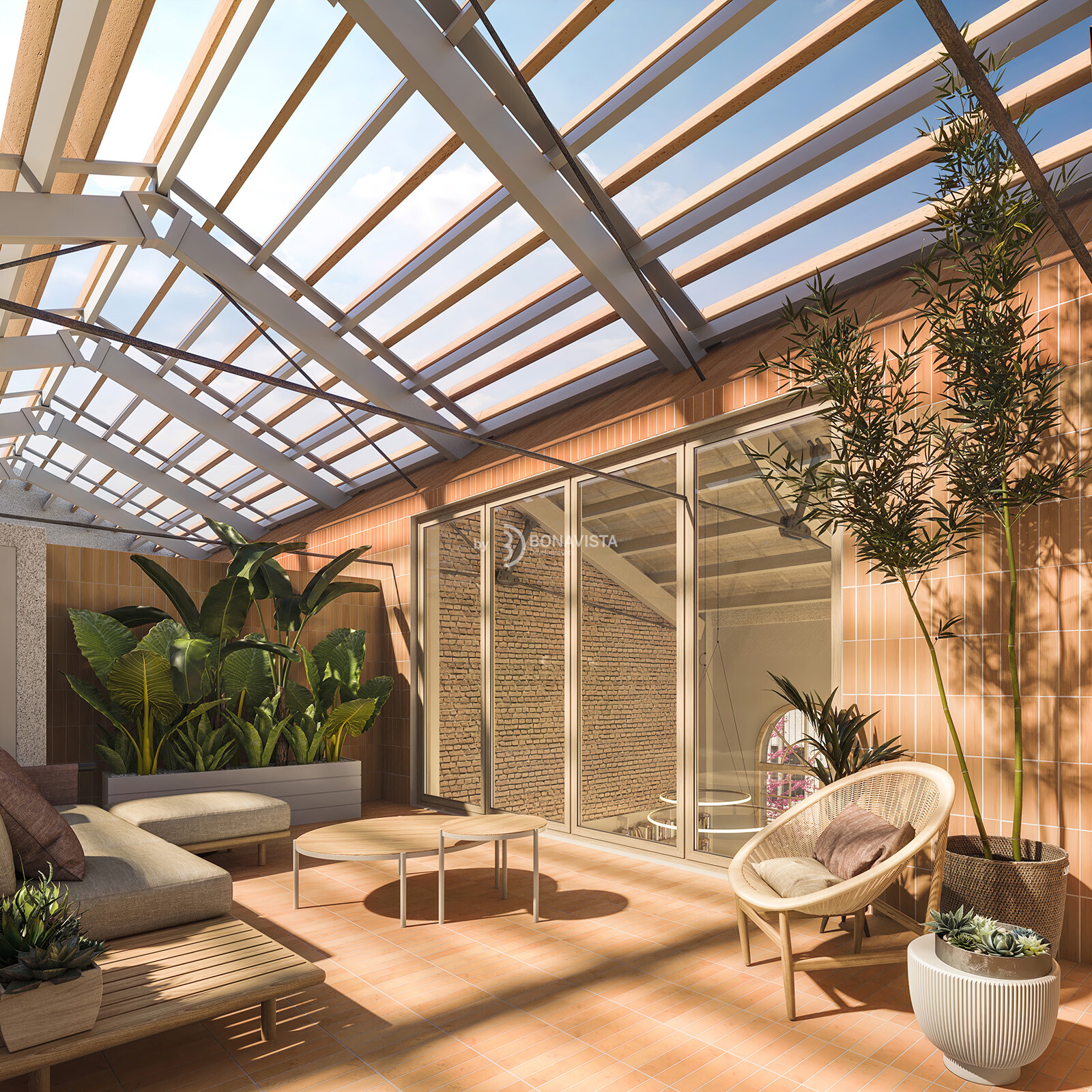 Una de las características más originales de estos pisos en venta en Poblenou es la generación de nuevas fachadas interiores, vaciando parte de las estructuras originales. Espacios diseñados para que la luz natural bañe las viviendas desde las grandes aperturas de las cubiertas.