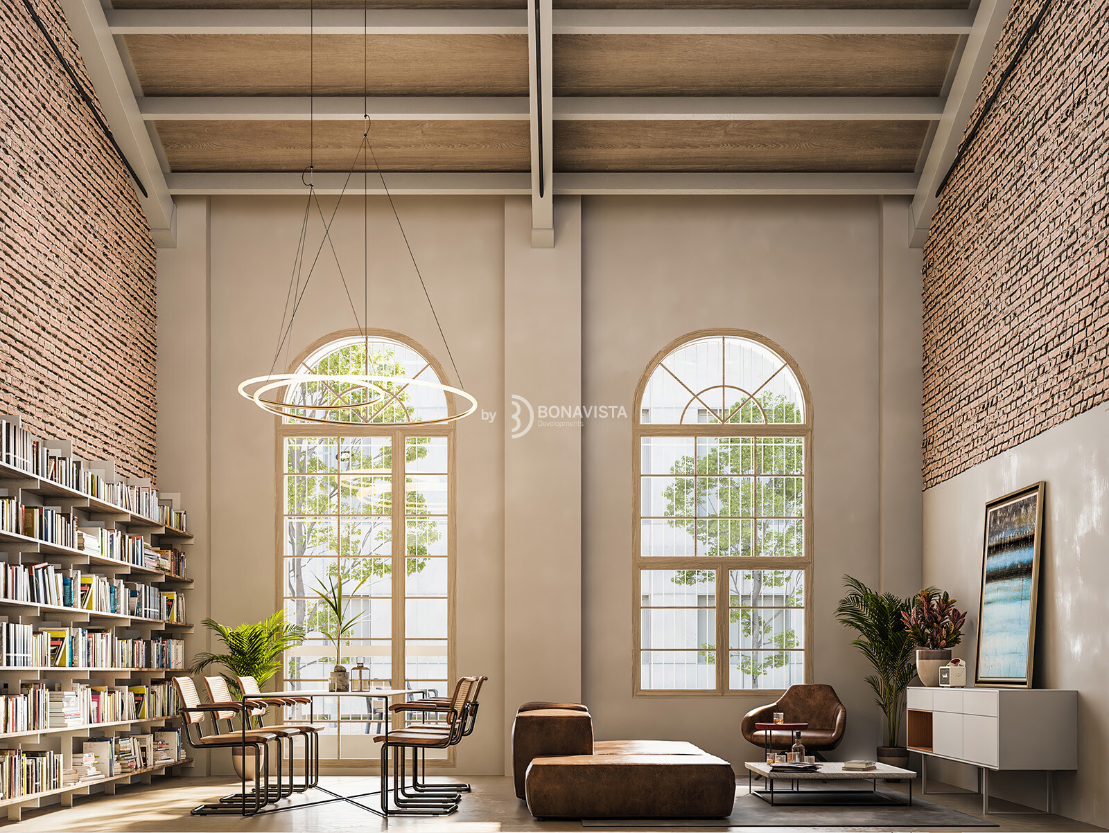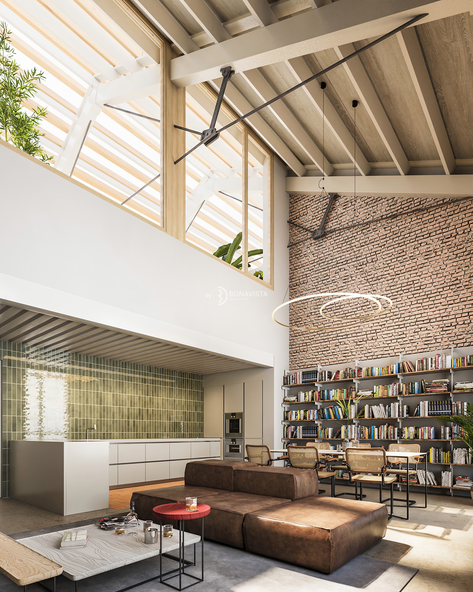 La continuidad histórica del proyecto integra, por un lado, el uso de materiales originales, como las paredes de mahones, las cerchas y las estructuras metálicas vistas y, por otro, los aspectos más emblemáticos de los loft neoyorkinos: espacios diáfanos, techos altos con arcos, y grandes ventanales que dan un espíritu único a estos lofts industriales en Barcelona.