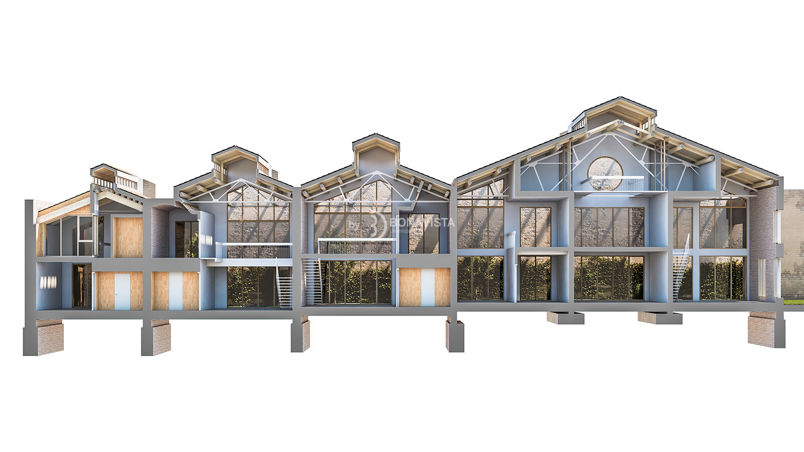 La nave D es la construcción más cercana al concepto de loft americano por sus grandes alturas, ventanales a lo largo de toda la fachada y esa presencia de luz tamizada. El proyecto presenta 2 lofts en planta baja y en la segunda planta un loft y un dúplex con gran terraza.